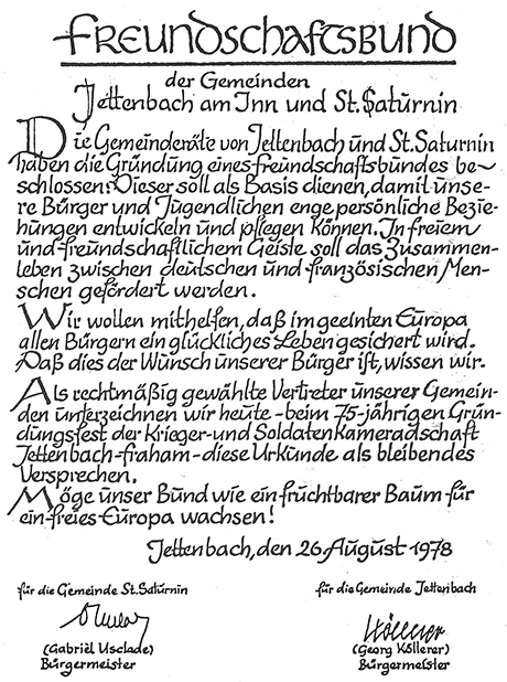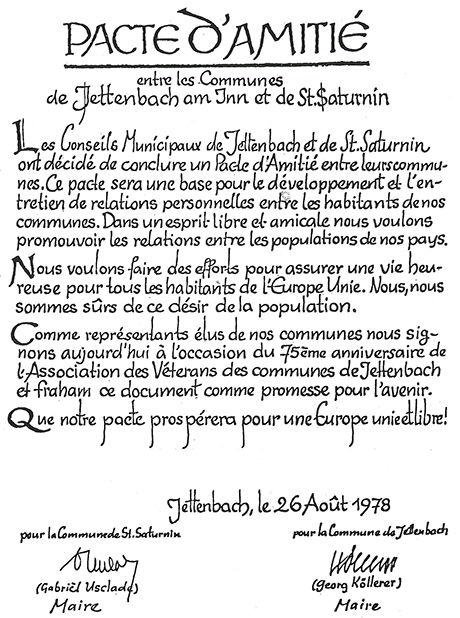 Lorsque les conseillers municipaux de Saint Satumin et de Jettenbach approuvèrent le jumelage, l’affaire fut bouclée. Le 26 aout 1978 on signa à Jettenbach les documents de l’alliance amicale. Et le 15 juillet 1979 eurent lieu les festivités de jumelage à Saint-Saturnin.
