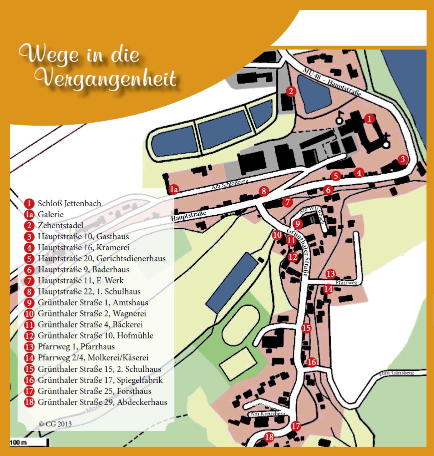 Der interessierte Besucher kann über den Schlossberg, die Hauptstraße, Grünthaler Straße und Pfarrweg an insgesamt 18 Gebäuden, die teilweise aus dem 12. Jahrhundert stammen, sehr viel über die Entwicklung und Historie von Jettenbach erfahren.